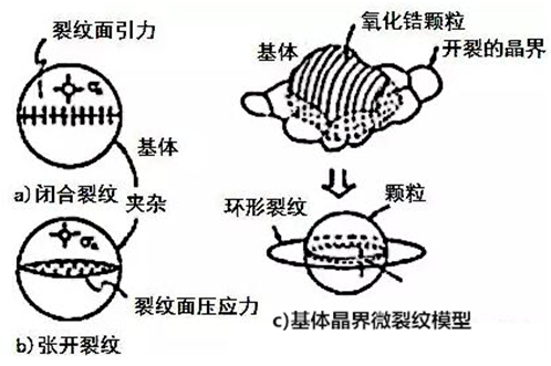 誘發(fā)微裂紋增韌主要有三種方法:1、完成燒結(jié)后,溫度降低過程中,自然產(chǎn)生;2、燒結(jié)溫度過高,晶粒異常長大,產(chǎn)生微裂紋;3、材料受到外界應(yīng)力作用。然而微裂紋增韌只增加了陶瓷集體的韌性,而對其強(qiáng)度是有很大的影響的,因此實(shí)際操作中,應(yīng)適當(dāng)控制微裂紋的產(chǎn)生。