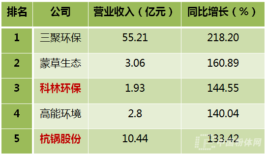 表2  2017年一季度中國環(huán)保上市企業(yè)營業(yè)收入增速TOP5
