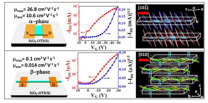 有機分子大多是通過極弱的范德華力相互作用而形成晶體,因此多晶相是有機半導(dǎo)體材料中非常普遍的一種現(xiàn)象。不同堆積結(jié)構(gòu)的晶相具有不同的電子耦合作用,從而導(dǎo)致不同的電荷傳輸行為。如何可控組裝生長高遷移率的晶相一直以來都是分子電子學(xué)中一個極具有挑戰(zhàn)性的課題,涉及到分子結(jié)構(gòu)、晶體工程和超分子自組裝等多方面的內(nèi)容。